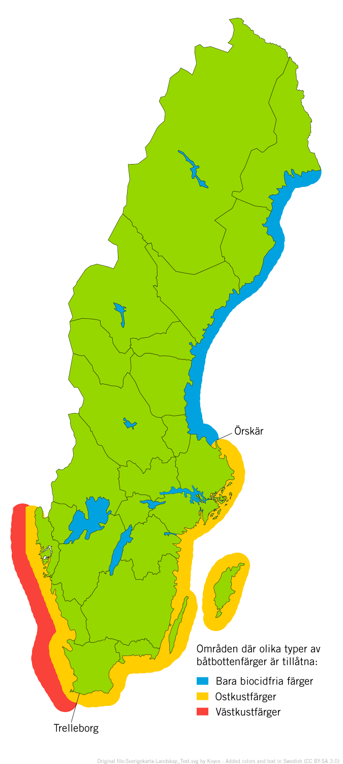 Västkusten: På grund av högre salthalt och större påväxtproblem är vissa biocidfärger godkända för användning här.